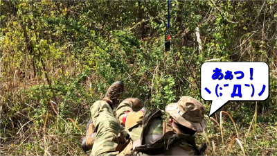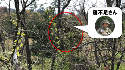 その様子を後方から暫し眺めていた管理人は、林の中盤辺りにあるコブの手前で警戒中のSDCさん達に合流したんだけど、SDCさん達が何故か10時方向(斜め左)へと進路を変更したので、どーしたのかと思ったら、コブ越しに見える前方約15mの位置に敵影×1を発見!