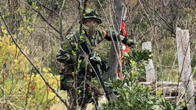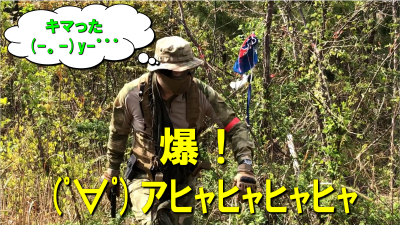 管理人撃墜で位置を特定されたサンコンさんが、コブを下り斜面のフィールド東側から回り込んだSDCさん達に撃墜されたのを確認しつつ、退場のため林の中を歩いていると、両チームが交戦している中央ルートのど真ん中へ、赤チーム側から『特攻ヤロウ豚野郎』いそべえさんが、猛ダッシュで、